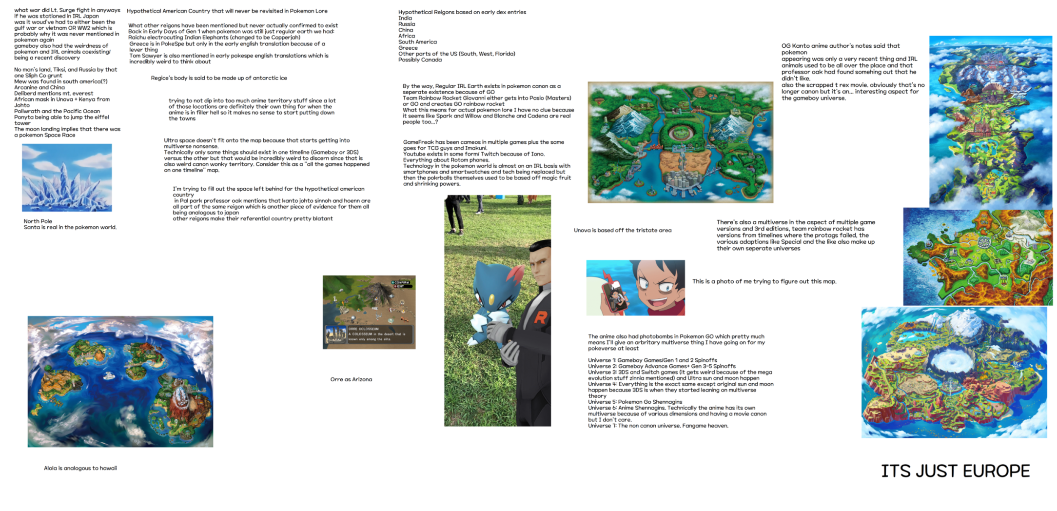 I thought "making a map won't be so hard, right? I just need to get photos of regions and place them in correspondence to some references." And then I hit spinoff and early generational weirdness. Then it got really weird. By the time I finished I felt like I delved into the rambling mind of one of those game theorists. And I had to split the map because of said theories. The original map ended up being 41 MB meaning it went above and beyond PF's limit. So I had to take a screenshot of a doc instead to make it fit. Spoilers for Paldea's endgame story in terms of certain pokemon. I completely neglected the DLC areas.